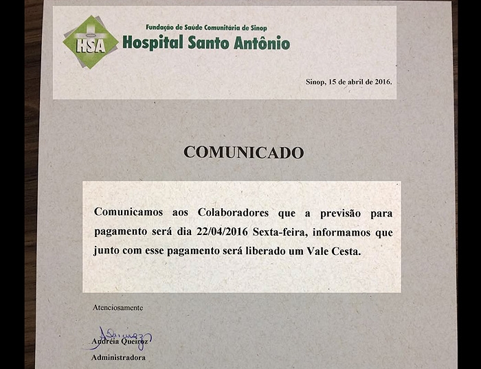 PUBLICIDADE Comunicado de pagamento do Hospital Santo Antônio – abril 2016 (divulgação) PUBLICIDADE 28/04/2016 10:03 Notícia anteriorFertilizante apreendido em Lucas (ass)Próxima notíciaExonerados presidentes da Codevasf e da Casa da Moeda COMPARTILHE: FacebookTwitterPinterestWhatsApp PUBLICIDADE PUBLICIDADE PUBLICIDADE PUBLICIDADE PUBLICIDADE Mais notíciasRelacionadas Sinop: carro aquaplana em via lateral da BR-163, cai em rio e dois morrem Ana Dhein - O acidente com o Toyota Corolla foi, ontem no... Sorriso: carro capota e cai em ribanceira Ana Dhein - O acidente com um automóvel foi, há pouco, no... Ídolo, Arrascaeta renova com o Flamengo até 2028: “Uma das notícias mais felizes da minha carreira” Ana Dhein - A nação Rubro-Negra ganhou uma ótima notícia neste fim... Homem é morto a tiros e outro baleado em Sinop Ana Dhein - A Polícia Militar foi acionada, no final desta tarde,... PUBLICIDADE