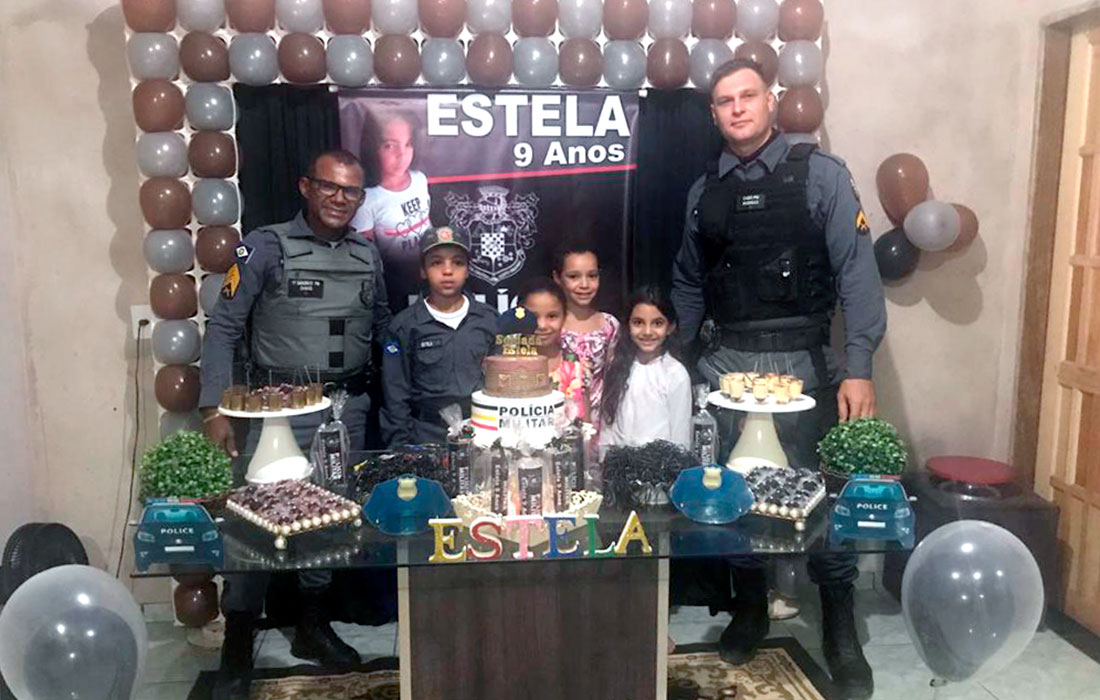 A estudante do ensino fundamental e admiradora da Polícia Militar, Estela Dornelas da Silva, de 9 anos, ganhou, ontem, uma visita surpresa dos policiais durante sua festinha de aniversário, que estava toda decorada com enfeites e até o brasão da PM. Além disso, ela estava vestida com fardamento.
