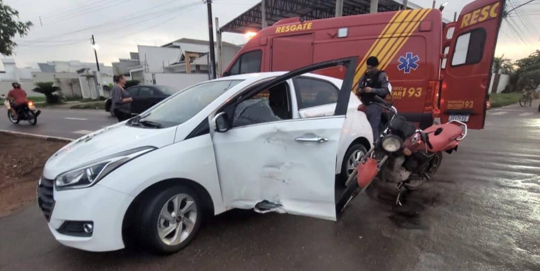 A colisão foi entre um veículo HB20 branco e uma moto Titan vermelha, no cruzamento da rua dos Guarantãs com Buritis, no Jardim Maringá. Os bombeiros socorreram duas pessoas que estavam na moto.