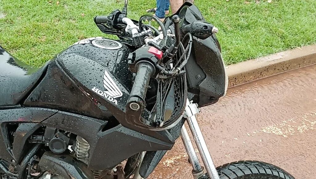 O carro teve para-choque e capô danificados, enquanto a moto teve danos no guidão e retrovisores.