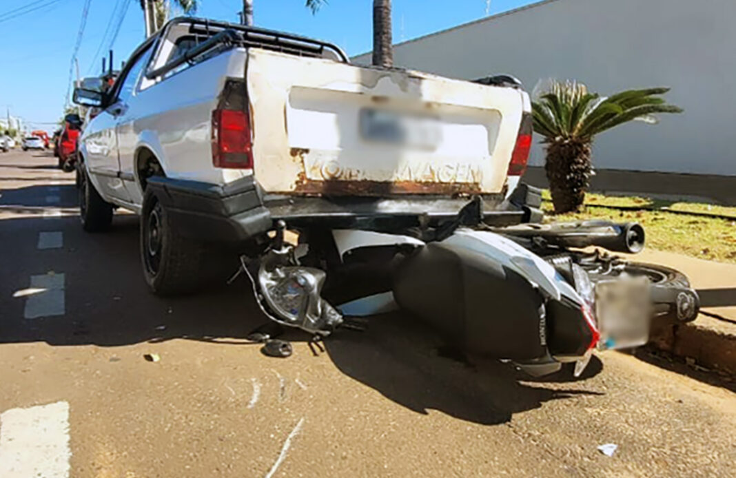 O acidente envolvendo a Honda Biz preta e a VW Saveiro branca foi, há pouco, na rua das Caviúnas, na área central. Os ocupantes da motocicleta foram socorridos pelo Corpo de Bombeiros, o condutor foi encaminhado ao hospital regional com suspeita de fratura no pulso.