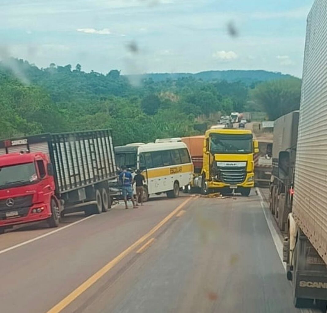 O engavetamento envolvendo um ônibus escolar, um caminhão boiadeiro Mercedes Benz vermelho e uma carreta DAF amarela ocorreu ontem, no trecho da BR-163 em Terra Nova do Norte (154 km de Sinop), próximo à oitava agrovila. No ônibus havia apenas o motorista, que sofreu ferimentos leves nos pés.