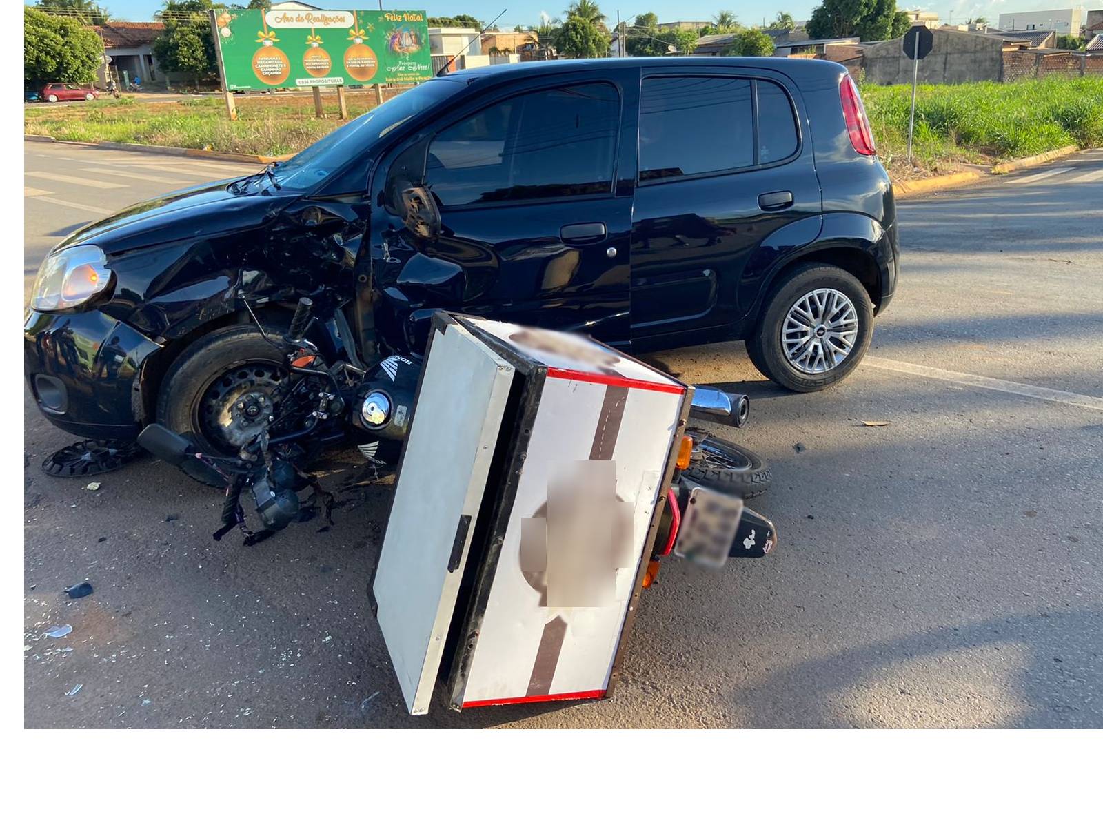 Com o impacto, o Uno ficou com a parte lateral bastante danificada, enquanto a motocicleta teve danos na parte frontal e carenagens. Ambos os veículos ficaram na via. Uma equipe da Polícia Militar foi acionada.