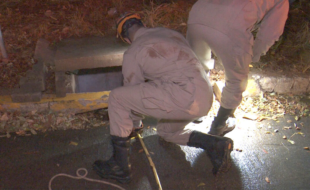 Os militares foram informados que as pessoas ouviram os miados na direção do bueiro. Para o resgate, foi feito o levantamento da tampa (com o uso de calços) e um bombeiro acessou a vala, inicialmente equipado com cambão.