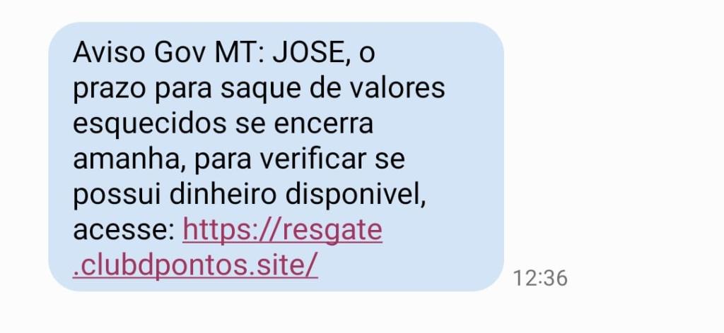 O link é enviado por SMS ao cidadão com a seguinte mensagem de texto: “Aviso Gov MT: NOME DA PESSOA, o prazo para saque de valores esquecidos se encerra amanhã, para verificar se possui dinheiro disponível”, e disponibiliza um endereço eletrônica.