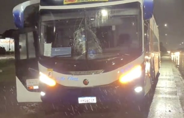 “Pelo que a gente conseguiu ver ali, da onde o ônibus parou, cerca de 7 metros de distância do ônibus.” Com o impacto, o ônibus teve o para-brisa quebrado.