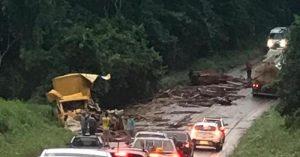 De acordo com a Polícia Rodoviária Federal, o motorista da carreta não se feriu, ele relatou que seguia sentido a Nova Santa Helena, e em uma curva ouviu um estralo na carga, em seguida, o último semi-reboque tombou e atingiu o caminhão que vinha no sentido contrário.