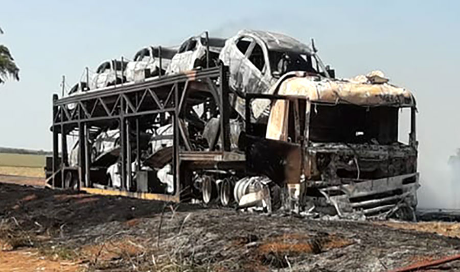 Um caminhão cegonha pegou fogo, ontem, na BR-364, no município de Pedra Preta (240 quilômetros de Cuiabá). O motorista não se feriu. Cerca de 11 carros, modelo HB20, que eram transportados também foram consumidos pelo fogo.  Os bombeiros tiveram muito trabalho para acabar com as chamas.
