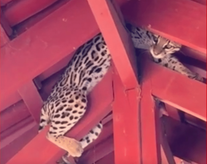 “Ficamos ouvindo os cachorros latirem a noite toda e minha mãe ouviu até uns arranhões na parede do quarto. De manhã, minha mãe foi procurar alguma coisa, passou por baixo dela e na hora que voltou e olhou para cima, viu a jaguatirica e gritou ‘Tem um filhote de onça aqui!’, disse Gabriela Mildeberg, em entrevista ao portal G1.