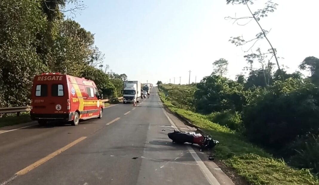 O motociclista de 25 anos foi socorrido em estado grave de saúde, esta manhã, após se envolver em uma colisão com uma carreta no trecho da rodovia federal na região conhecida como ‘baixada do 15’, pelas equipes do Corpo de Bombeiros, Via Brasil e Nova Rota do Oeste.