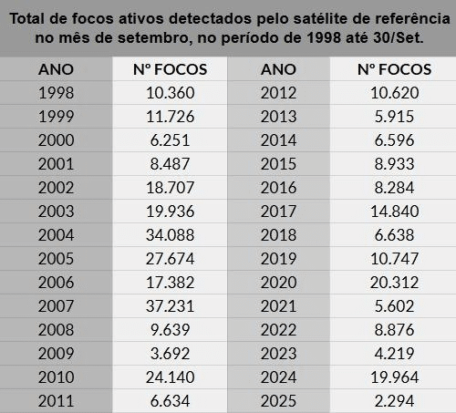 Mato Grosso encerrou o mês de setembro com o menor número de focos de calor já registrado desde o início da série histórica do Instituto Nacional de Pesquisas Espaciais (Inpe/BD Queimadas), iniciada em 1998. Foram contabilizados 2.294 focos no período, superando o recorde anterior de 3.692 ocorrências registrado em 2009, valor que também corresponde à média histórica para o mês.