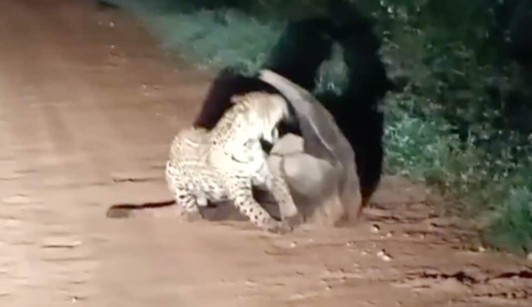 É possível ver, a partir do vídeo, o momento em que ambos se encontram na estrada. A onça avança contra o mamífero de grande porte, na tentativa de dominá-lo, mas acaba sendo repelida e afugentada na sequência. O tamanduá, que pode chegar a medir 1,3 metros de comprimento e pesar até 31,5 quilos, pode usar suas garras poderosas em situações de autodefesa.