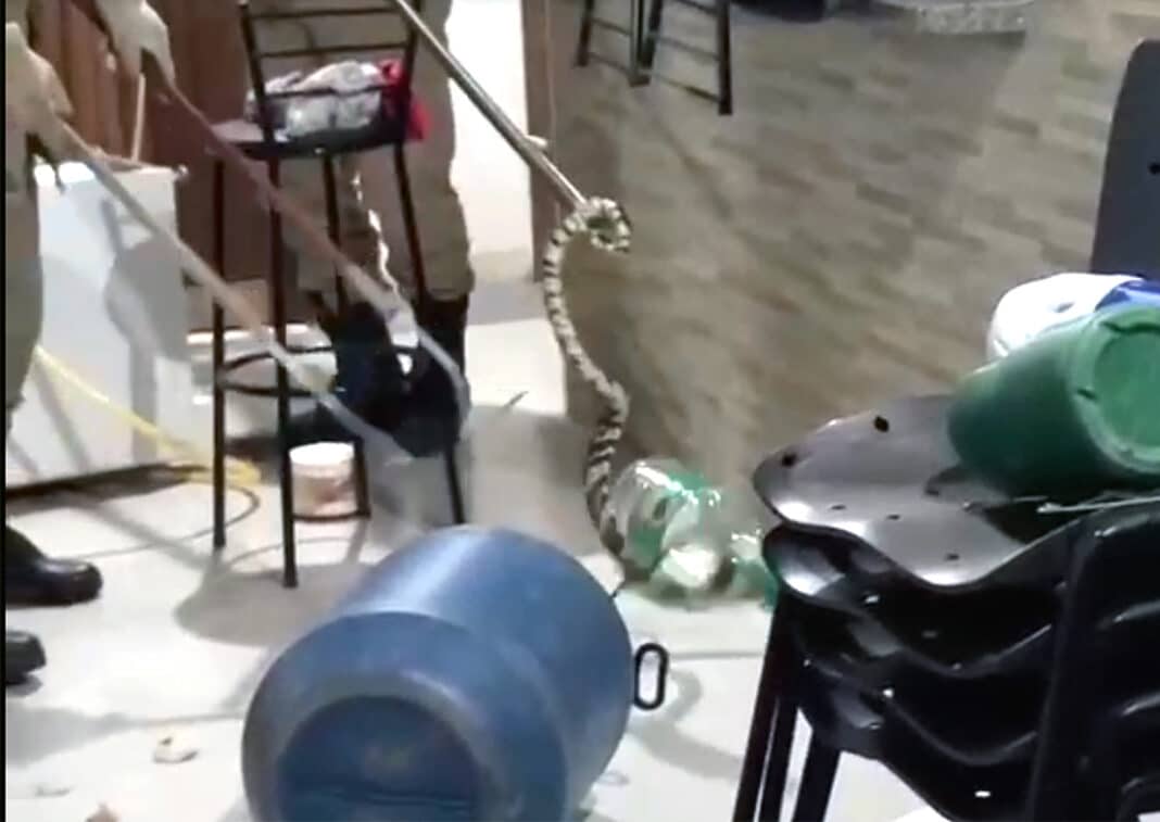 Dado ao risco para ela e os filhos menores, realizou o acionamento imediato dos militares. A equipe encontrou o animal enquanto tentava se abrigar em baixo do fogão e conseguiu removê-lo com equipamentos de uso convencional (pinça de manejo e gancho). Posteriormente, foi acondicionado em recipiente adequado e transportada ao habitat.