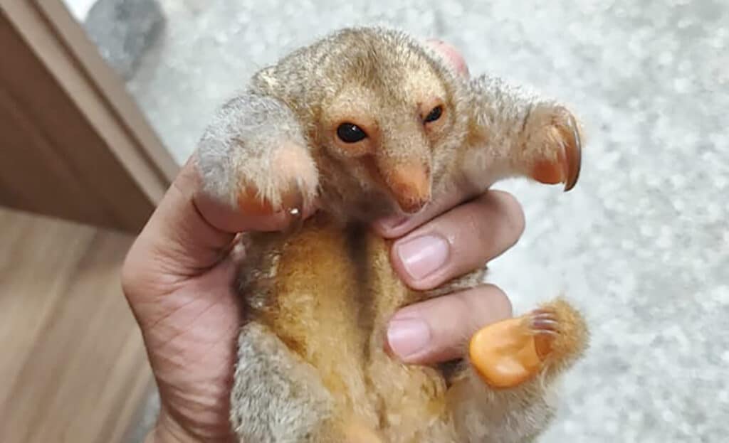O filhote de tamanduaí (Cyclopes didactylus) foi encontrado, ontem à noite, em meio a uma estrada vicinal, nas proximidades da área urbana de Sorriso. Um casal relatou ter avistado o animal tentando atravessar o trecho e, devido ao risco de atropelamento, o encaminharam até a unidade dos bombeiros.