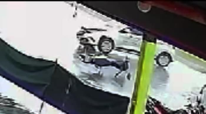 A partir de imagens registradas por sistema de monitoramento, é possível ver momento em que ambos acabaram se chocando num cruzamento. O impacto fez com que o motociclista perdesse o capacete e fosse arremessado por alguns metros.
