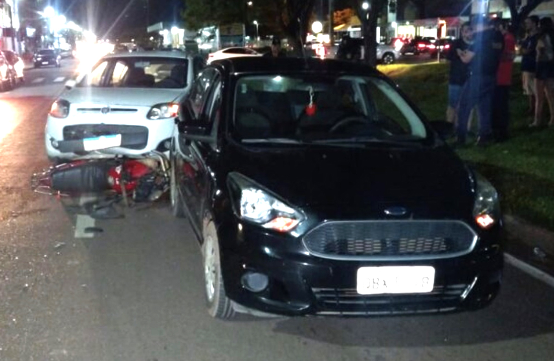 Um acidente foi registrado, ontem à noite, no centro de Sinop. A colisão envolveu uma motocicleta Honda Titan vermelha, um Ford Ka preto, com placas de Várzea Grande, e um Fiat Pálio branco.