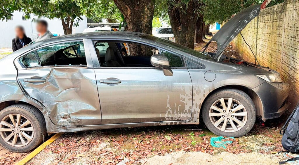 “Para a guarnição, o motociclista informou que o veículo o fechou e ele acabou colidindo. A Polícia Militar vai ao local e pegará as informações dos dois lados”, relatou o cabo Viana. Com o impacto, a moto teve o pneu dianteiro arrancado e o carro teve a lataria amassada e os vidros da lateral direita quebrados.