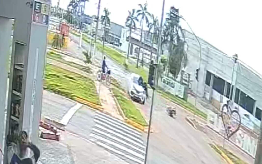 As imagens mostram o automóvel seguindo pela avenida, sentido residencial Daury Riva, quando, no cruzamento, ocorre a colisão com a motocicleta. Com o impacto, o condutor da moto é projetado sobre o veículo e cai logo em seguida, por pouco não sendo atropelado.