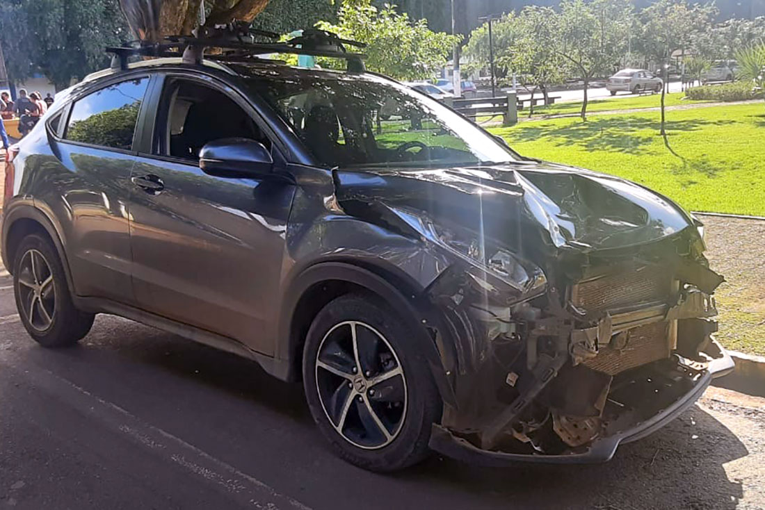 O carro ficou com a parte frontal bastante danificada. O para-choque caiu e o capô amassou.