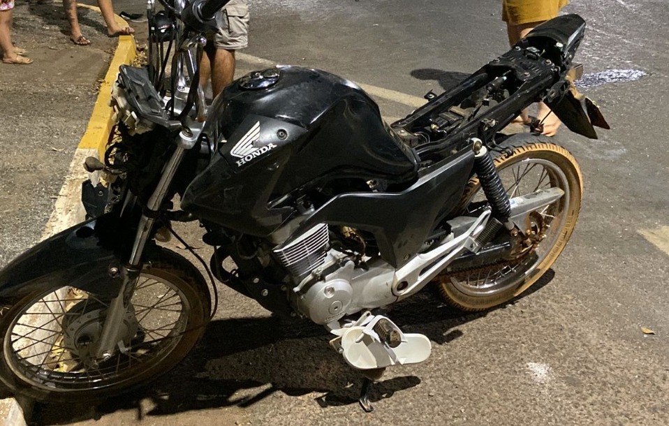 A caminhonete ficou com a lateral danificada, enquanto a moto teve danos na parte frontal e no banco. A Polícia Militar esteve no local.