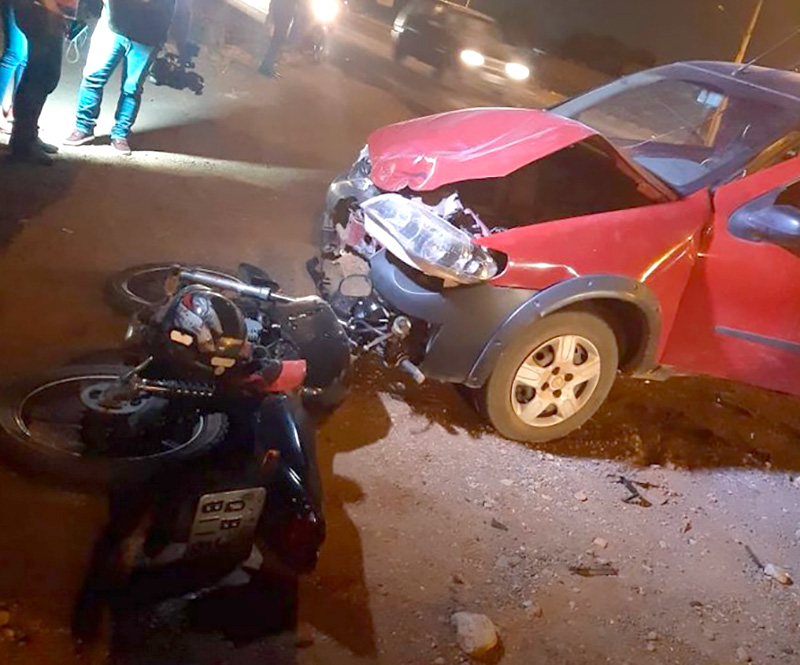 Um motociclista ficou ferido, esta noite, após colidir com um utilitário Fiat Strada vermelho. O acidente aconteceu na MT-140, que liga Sinop a Santa Carmem, nas proximidades do bairro Jardim Buritis.