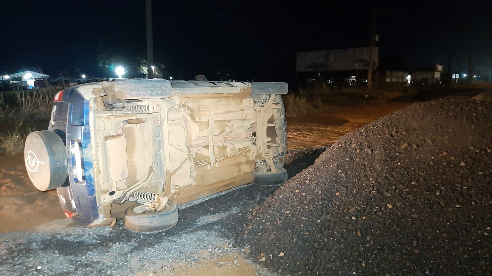 Uma Ford Ecosport acabou tombando, há pouco, em uma via localizada às margens da BR-163, próximo ao bairro Leonel Bedin. O motorista disse que o acidente ocorreu após atingir uma pilha de resíduos de asfalto no local.