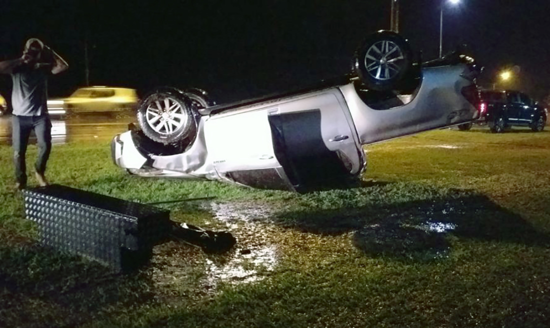 O acidente aconteceu, há pouco, no quilômetro 825 da BR-163, nas proximidades do Jardim América. A caminhonete Toyota Hilux prata, placas de Sinop, seguia sentido centro, quando houve o capotamento.