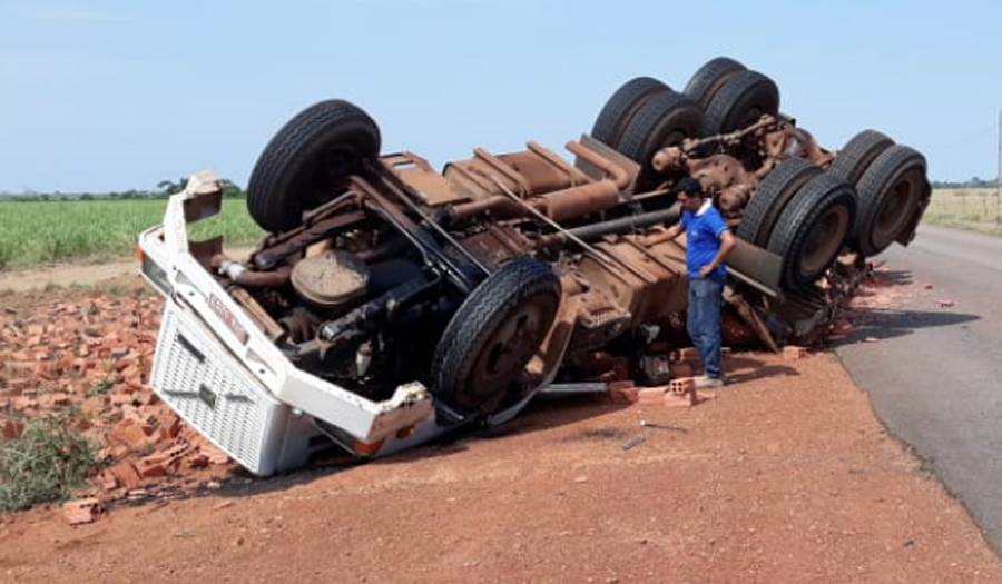 Motorista dorme ao volante e tomba carreta carregada com tijolos em MT; dois feridos