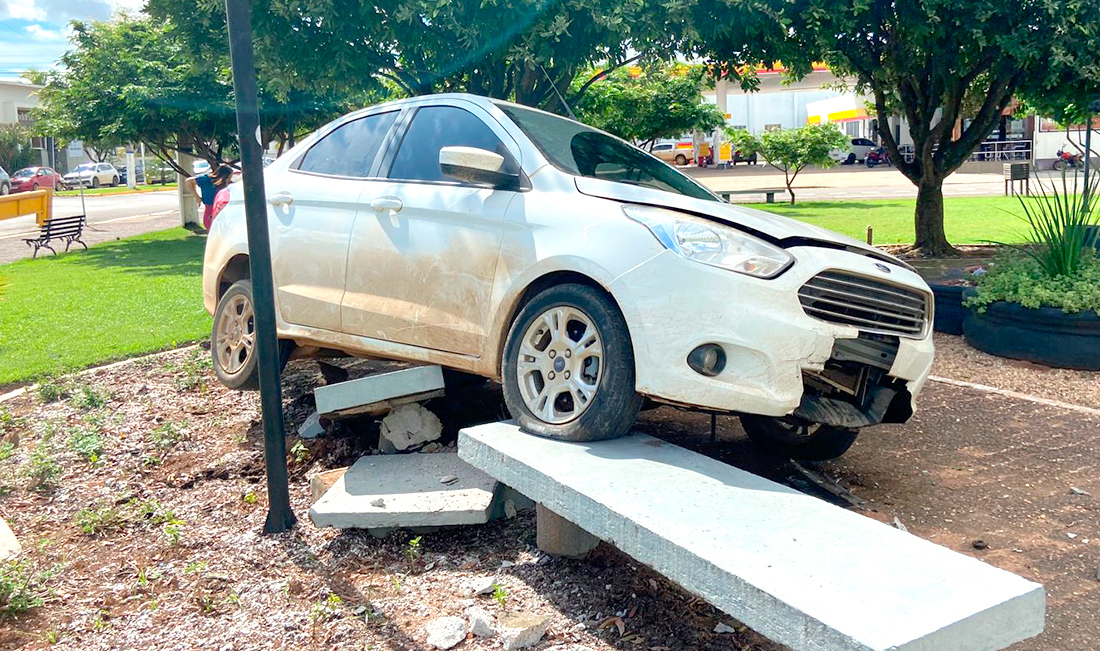 Assustada, a condutora do KA acabou perdendo o controle subindo no canteiro da praça, atingindo bancos de concreto que foram quebrados com o impacto, teve o para-choque quebrado e capô danificados. A Tracker não teve danos.