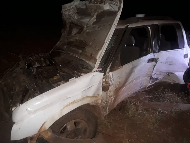 A caminhonete ficou bastante danificada, teve as laterais amassada e os vidros quebrados.