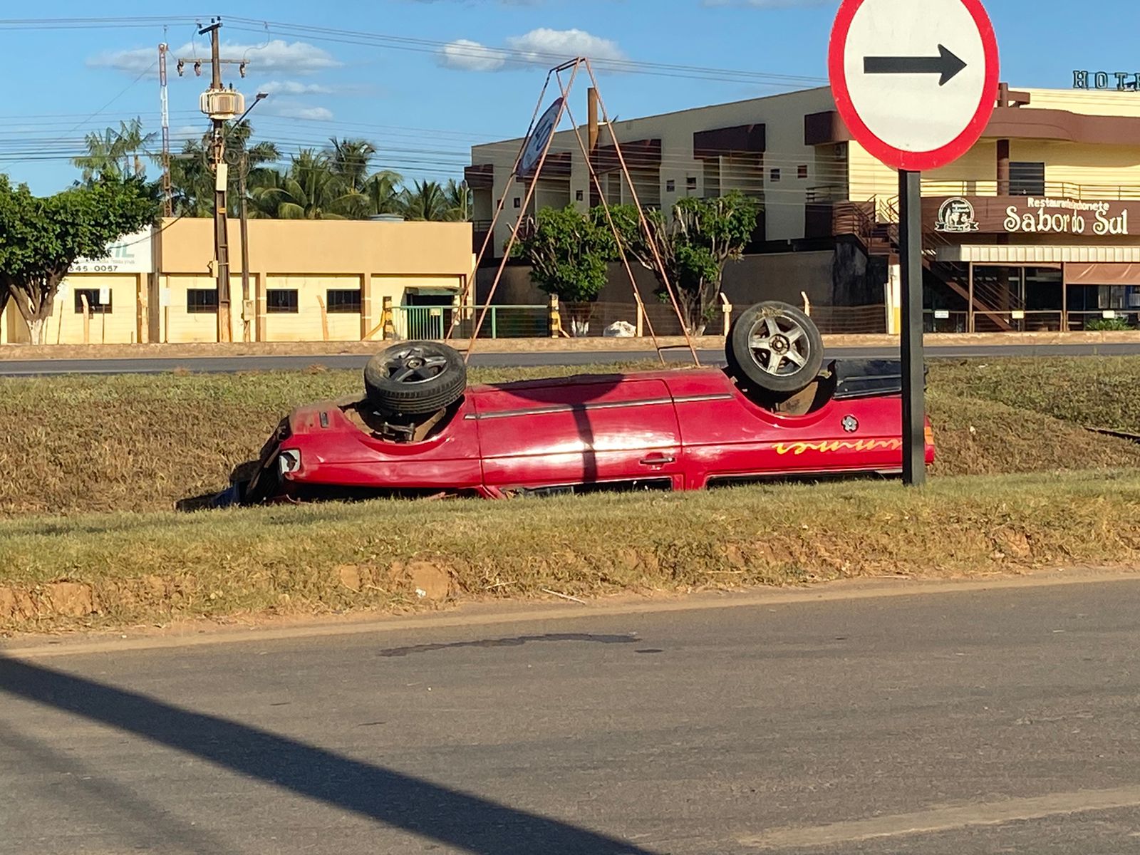 Um utilitário VW Saveiro vermelho caiu em uma vala de escoamento de água, na Perimetral Sudeste, às margens da BR-163. O acidente ocorreu esta tarde.