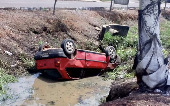 Um VW Gol vermelho caiu, há pouco, na vala de escoamento de água que divide a avenida dos Ingás, próximo a Unemat, no centro da cidade. O carro estava na Ingás sentido avenida dos Tarumãs e ficou com as rodas para o alto.