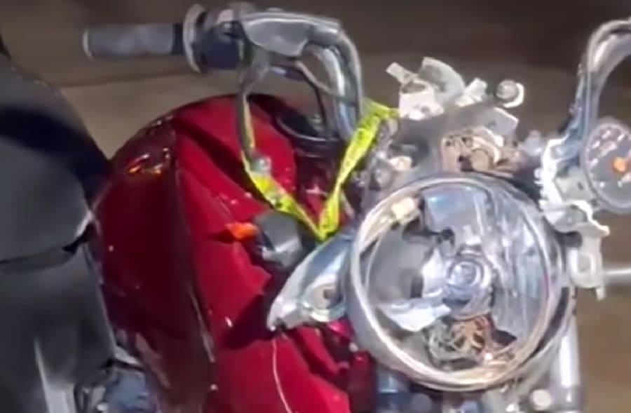 Já a Titan teve parte da estrutura frontal (painel, lanterna, luzes de seta, roda e pneu) avariada.