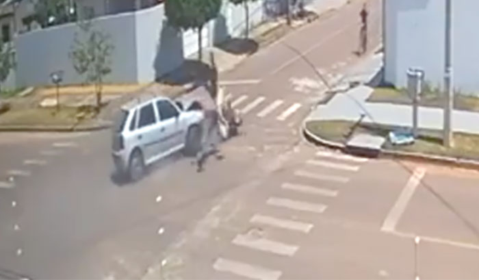 A colisão foi registrada pelo circuito de monitoramento de uma casa nas proximidades. No cruzamento, não há sinalização adequada com placa de ‘pare’, indicando qual via é a preferencial.