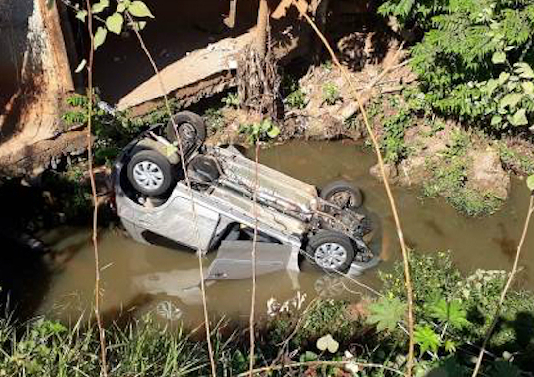 O carro ficou bastante danificado e parou com as rodas para o alto. Ele foi retirado do córrego com auxílio de um guincho.