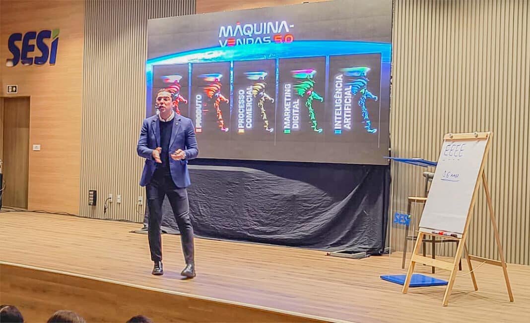 Ele apresentou a metodologia “máquina de vendas 5.0”, que propõe transformar a comercialização de produtos ou serviços numa operação “previsível, escalável e automatizada”, combinando três pilares principais: marketing digital com alto desempenho (incluindo uso de inteligência artificial), estrutura de funis de vendas bem definidos e organização de uma equipe comercial de alta performance com processos claros e roteiros padronizados.