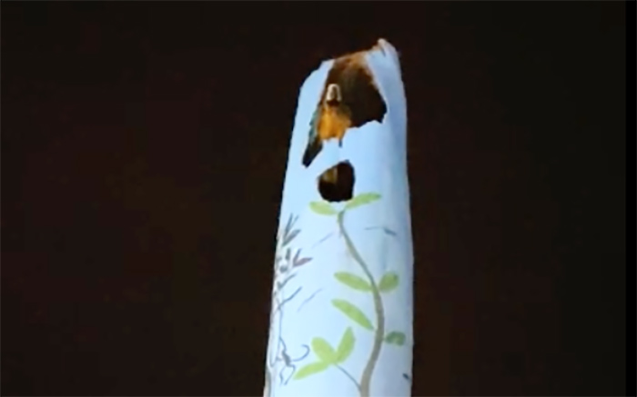 O tronco de uma palmeira, localizada na avenida das Acácias com a rua das Nogueiras, na região central da cidade e que abriga o ninho de um casal de araras canindé ganhou diversas figuras do bioma brasileiro. Agora, o local está servindo de cenário para fotografias dos pedestres que passam, ainda mais quando encontram as aves no alto de sua “casa” chamando a atenção. À noite, a pintura fica ainda mais bonita com iluminação das lâmpadas de led, que foram instaladas para dar mais visibilidade ao trabalho artístico.