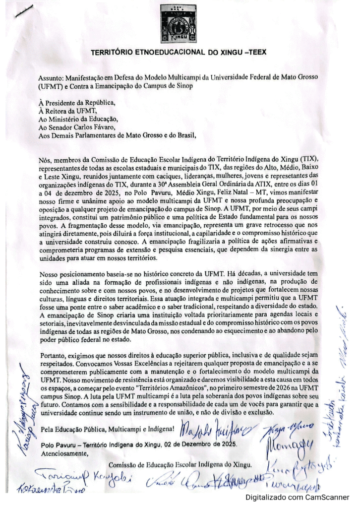Para as comunidades indígenas, a defesa da UFMT multicampi está profundamente ligada ao direito de permanecerem ativos na construção do próprio futuro, em especial nas agendas de formação profissional, produção de conhecimento, sustentabilidade territorial e direitos coletivos. “Nosso posicionamento baseia-se no histórico concreto da UFMT. Há décadas, a universidade tem sido uma aliada na formação de profissionais indígenas e não indígenas, na produção de conhecimento sobre e com nossos povos, e no desenvolvimento de projetos que fortalecem nossas culturas, línguas e direitos territoriais. Essa atuação integrada e multicampi permitiu que a UFMT fosse uma ponte entre o saber acadêmico e o saber tradicional, respeitando a diversidade do estado. A emancipação de Sinop criaria uma instituição voltada prioritariamente para agendas locais e setoriais, inevitavelmente desvinculada da missão estadual e do compromisso histórico com os povos indígenas de todas as regiões de Mato Grosso, nos condenando ao esquecimento e ao abandono pelo poder público federal no estado”, afirma outra parte do documento.