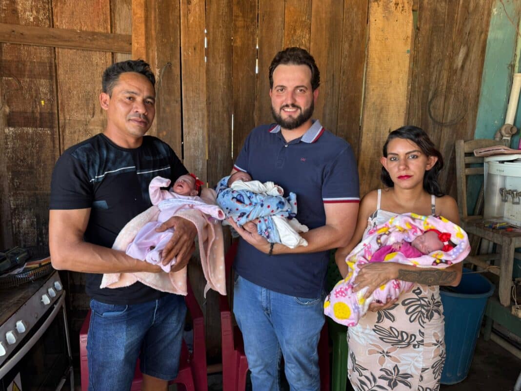 O prefeito de Vera (90 quilômetros de Sinop), Yago Giacomelli, e uma equipe da gestão visitaram hoje uma família que teve trigêmeos. O parto foi no dia 21 de junho, em Sorriso. Núbia Paula, de 30 anos, e Luciano, de 40, que agora vivem a emoção multiplicada com a chegada dos trigêmeos, já são pais de outros quatro filhos de 2, 7, 10 e 12 anos, somando sete crianças em casa.