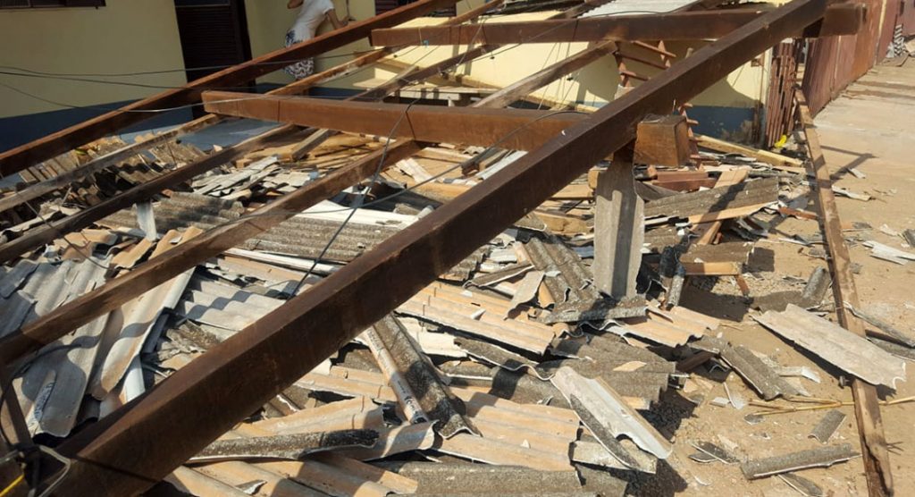 Um forte redemoinho – vento em forma de espiral – destruiu os telhados de pelo menos cinco quitinetes localizadas na rua Solimões, no bairro Vila Bela, há pouco. A estrutura de madeira e as telhas de amianto caíram e não houve feridos.