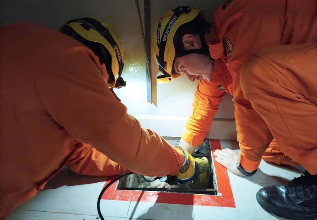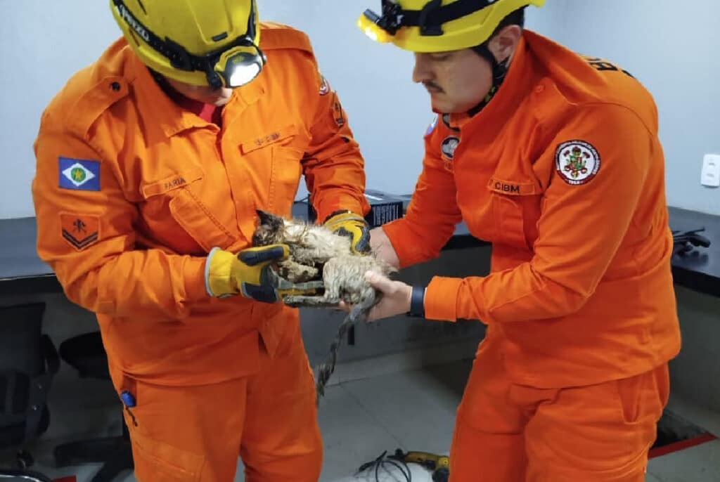 Os funcionários da empresa relataram que já havia “48 horas que se ouvia muito miado no subsolo, porém não era possível identificar o local” exato. Para a remoção do felino, foi quebrado concreto, com uma furadeira elétrica e talhadeira manual, e o gato retirado.