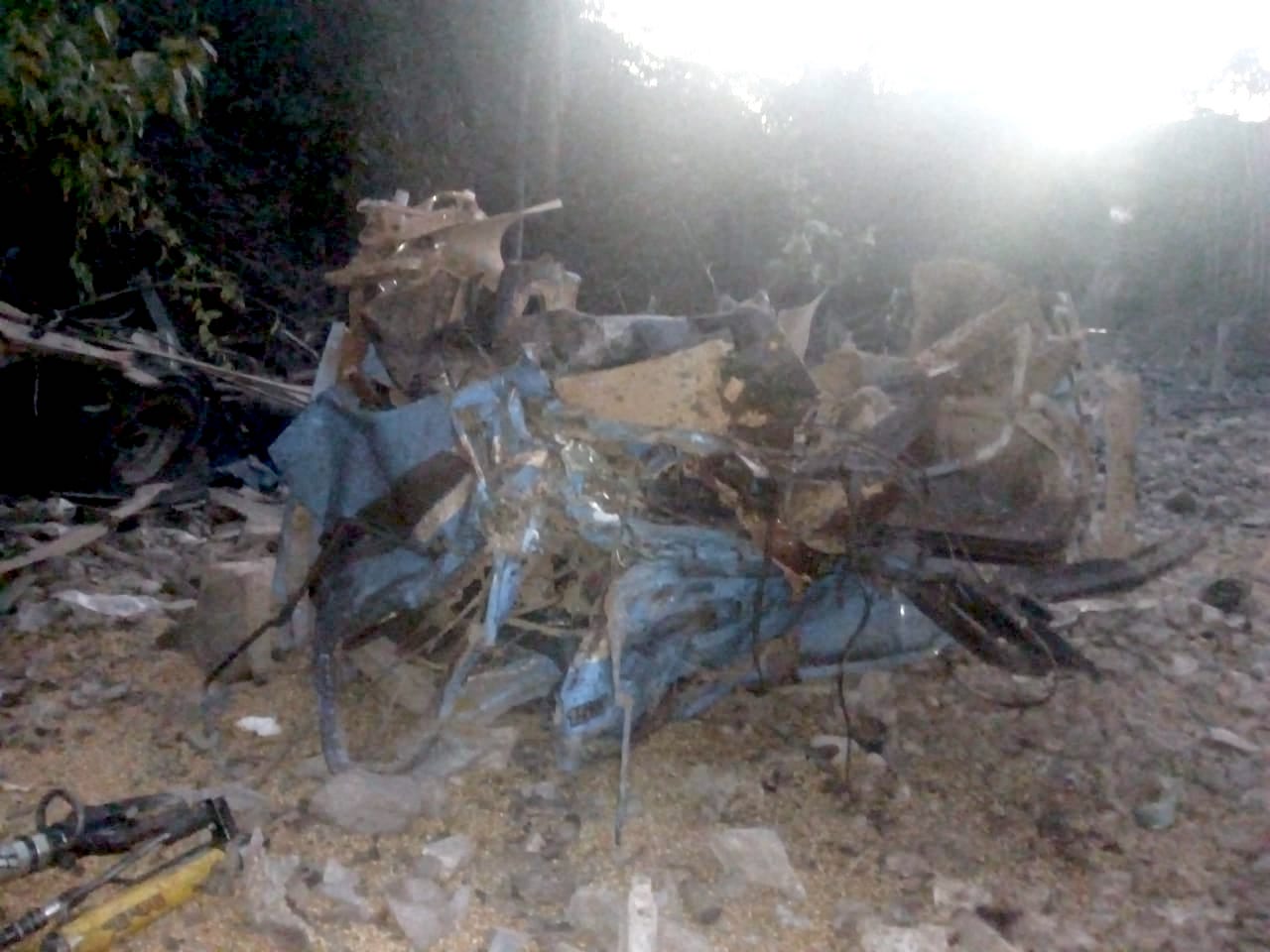 O caminhão ficou completamente destruído ao tombar de uma altura de pelo menos 50 metros. Ele deve ser retirado do local com auxílio de um guincho.