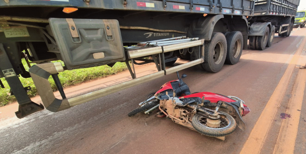 A colisão entre a motoneta Honda Biz e a carreta Scania Titanium ocorreu, há pouco, no km 853 da BR-163. A equipe médica da concessionária da rodovia encaminhou a motociclista para o hospital regional, com fraturas nos dois braços.