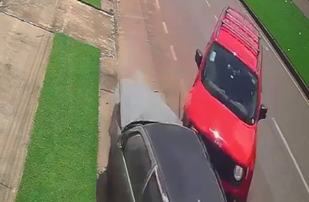 Imagens de câmeras de segurança mostram que o Renegade trafegava sentido BR-163 quando o motorista acaba se “distraindo” e bate no outro veículo, que estava estacionado.