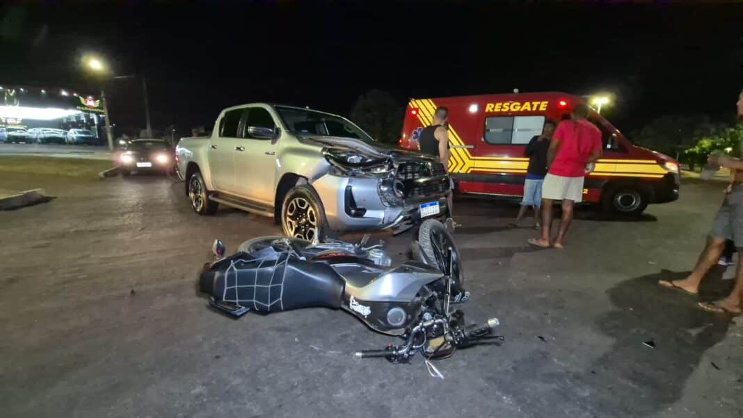 A caminhonete Toyota Hilux e motocicleta Honda, cor preta, colidiram, ontem à noite, no cruzamento da avenida André Maggi com rua dos Monjoleiros, no bairro Jardim Boa Esperança. O Corpo de Bombeiros encaminho um homem e uma mulher que estavam na moto a uma unidade de saúde, com ferimentos nas pernas, braços e faces.