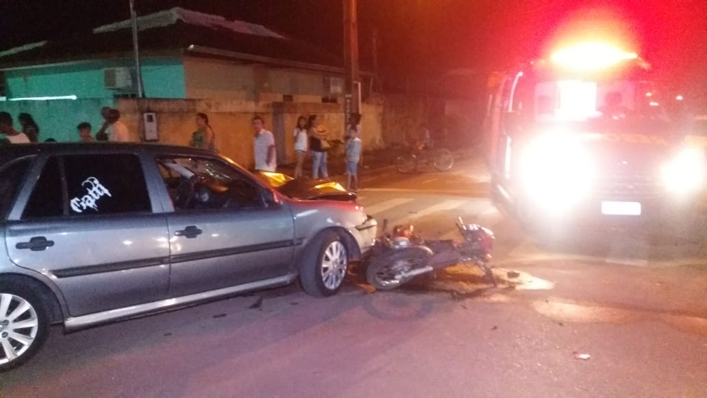 Um motociclista, identidade não confirmada, sofreu diversos ferimentos após colidir a moto Honda Bros vermelha, que pilotava, em um veículo VW Gol prata, na Rua 5, no bairro Jardim Novo Estado, há pouco.