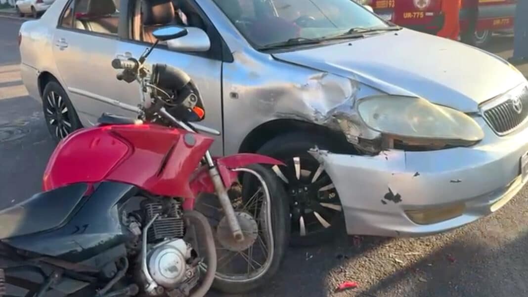 O acidente envolvendo o Toyota Corolla prata e a Yamaha YBR vermelha foi, ontem à tarde, no cruzamento entre as ruas 22 e 15, no bairro Gente Feliz. O motociclista foi socorrido pelo Corpo de Bombeiros e encaminhado até a unidade hospitalar.