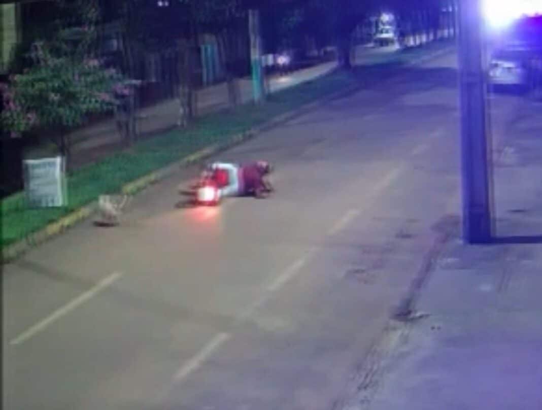Imagens de câmera de segurança registraram o momento em que trafegava pela avenida, momento em que o cachorro atravessou a pista. O animal se chocou com o homem, que acabou caindo. Durante atendimento médico no local, ele se queixava de várias dores pelo corpo, principalmente na perna.