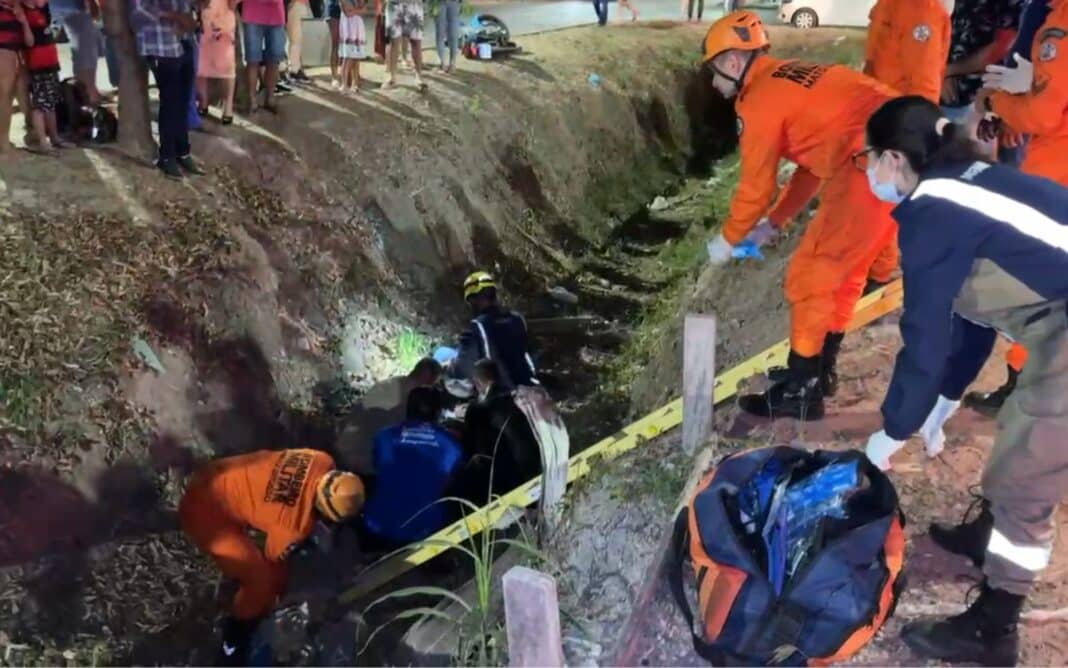 “A vítima tem cerca de 20 anos, foi arremessada a cerca de dois metros de profundidade, apresentava um quadro de TCE (traumatismo cranioencefálico) grave, bastante agitada, oscilando com períodos de uma hipoatividade, além de uma fratura no fêmur esquerdo”. “Foi feita uma restrição do movimento da coluna dessa vítima ainda na cena devido ao potencial de lesões da coluna nesse tipo de trauma”, informou Alef Rodrigues, médico socorrista do Corpo de Bombeiros.