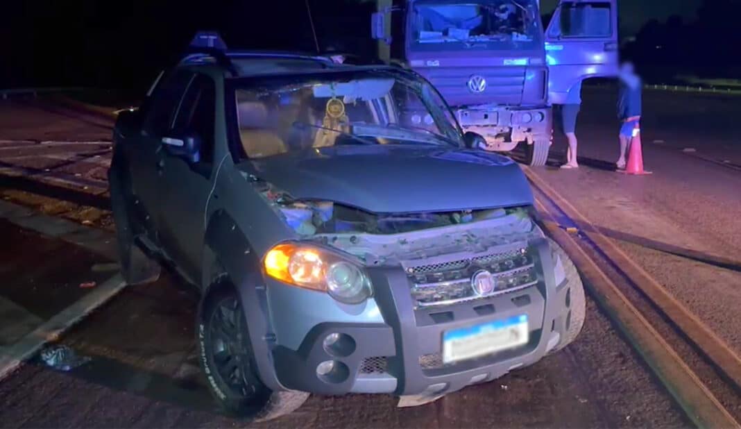O acidente entre uma Fiat Strada cinza e VW Worker 23.220 vermelha ocorreu, hoje de madrugada, no quilômetro 854 da rodovia federal, próximo ao bairro Camping Club. Três ocupantes do automóvel (incluindo uma criança) receberam os primeiros socorros da concessionária na rodovia e foram encaminhados para unidade hospitalar.